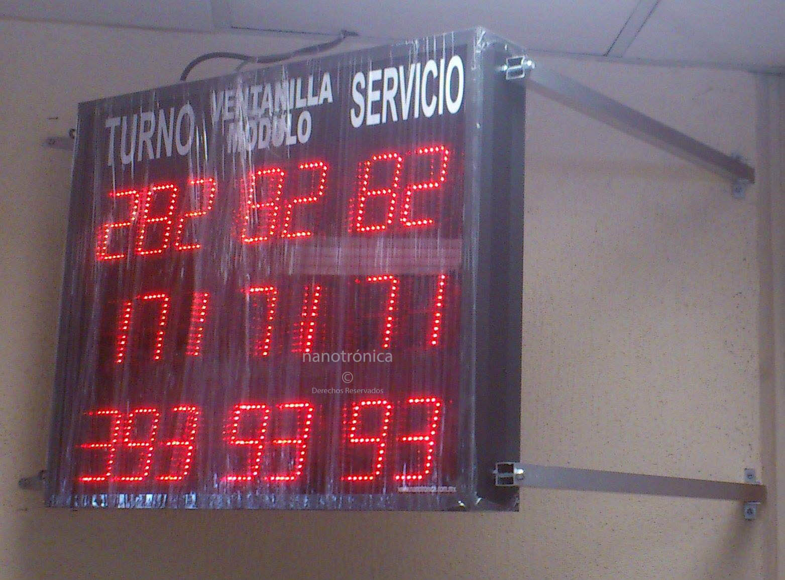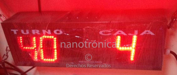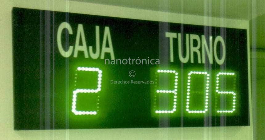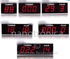 | TT-231 | 60m | 1 díg. de 20cm para indicar CAJA, 3 díg. para indicar TURNO a atender, programación por botón tipo push, se puede programar cualquier valor inicial y de alli se inicia la cuenta incremental, este equipo se puede adquirir por pieza o por paquete, en el que se incluye, además de la pantalla; dispensador de boletos, rollo de 10,000 boletos numerado, dimensiones de 80 x 30cm, hasta 8 cajas o puntos de atención al cliente. | ![]() |
