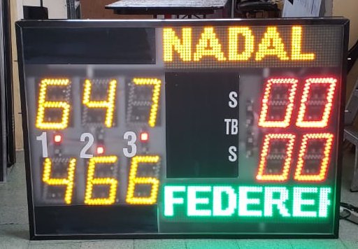 | Marcador para Tenis | 60m | 10 díg 20cm, dimensiones de 120 x 85cm, Control mediante aplicación para Android. Ventilador para mantener una temperatura de trabajo interna homogenea, Nombres de equipo programables, totalmente inalámbrico. Marcador de ganador por set, jugador al servicio y juego para desempate. 3 Sets | ![]() |