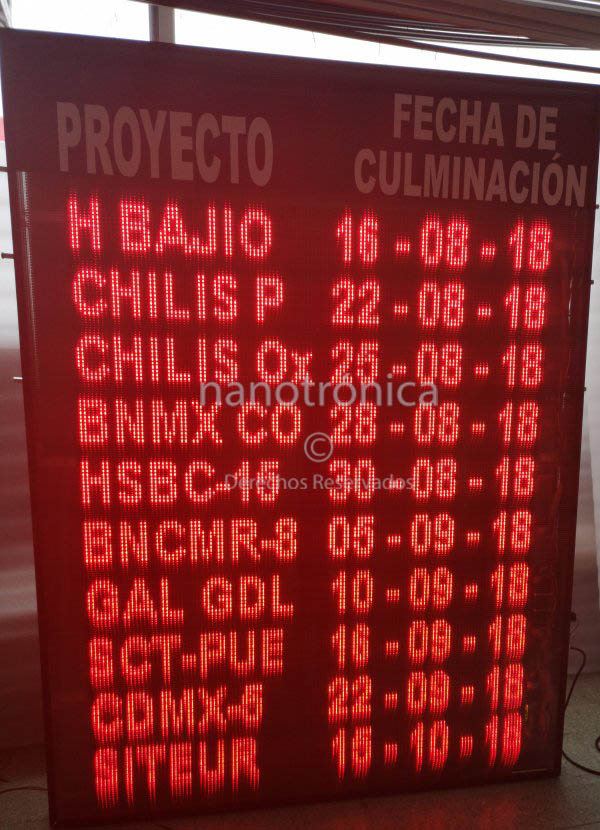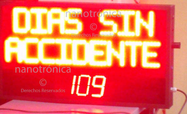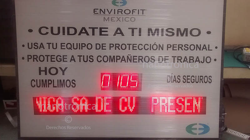 | TI Días Sin Accidente | 30m | En la parte superior compuesta de un mensaje fijo a base de leds mientras en la parte inferior consta de 3 dígitos de 10 cm de altura, programación mediante aplicación JAVA | ![]() |